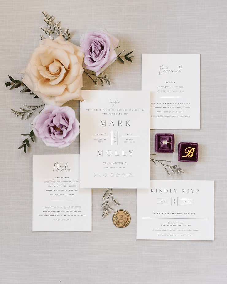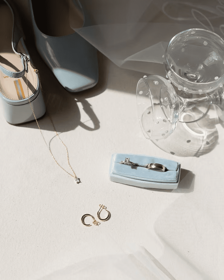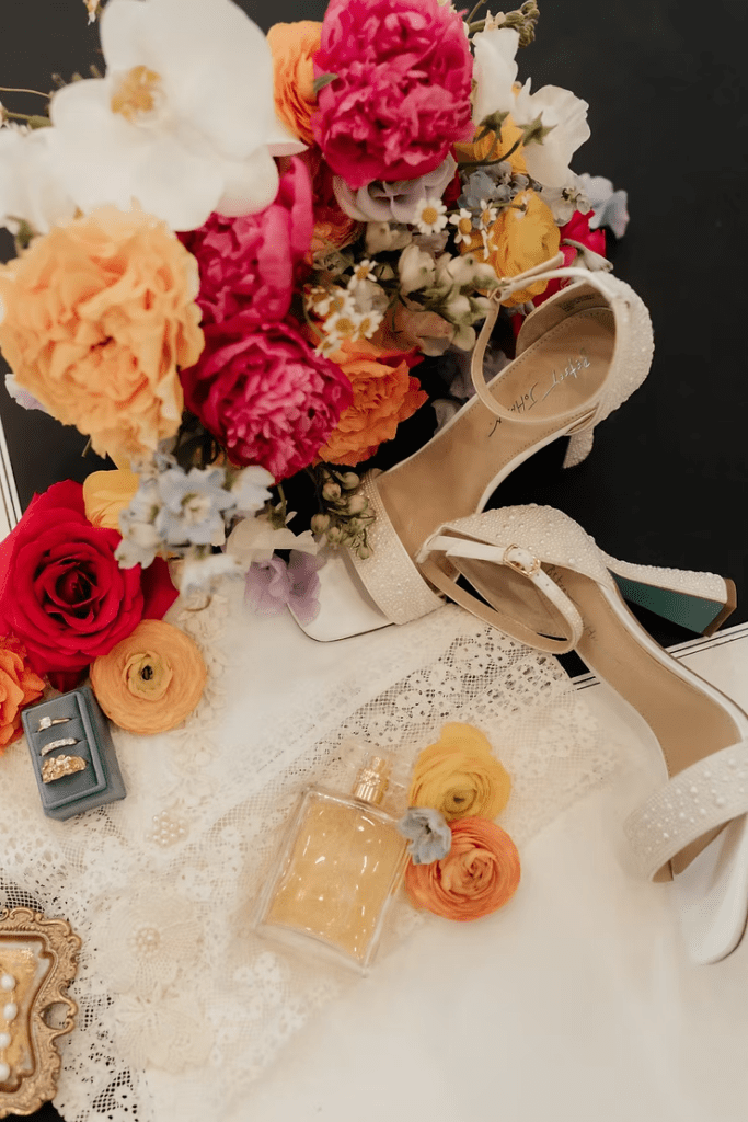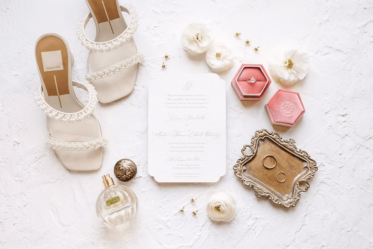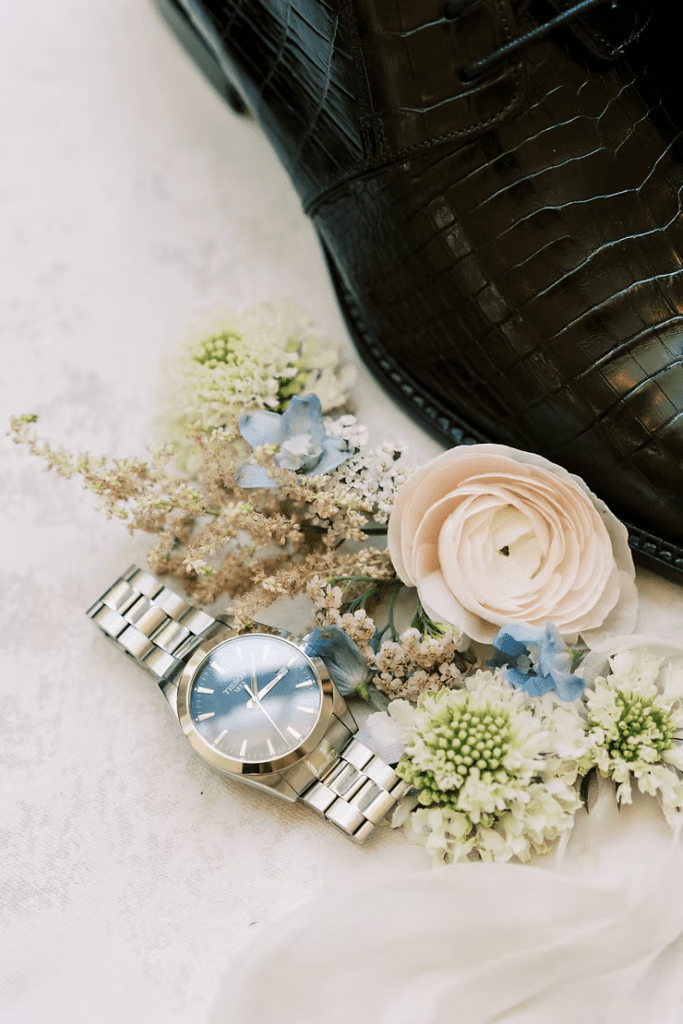Some brides like these keepsake photos, while others love them! If it’s important to you that flat lay photos are taken, I would suggest for the bride to have a conversation with the photographer about it before booking them for the wedding day. Some photographers have lots of experience shooting flat lays, and even have different flat lay backdrops, colored ribbon, & cute ring boxes to make the details stand out more.